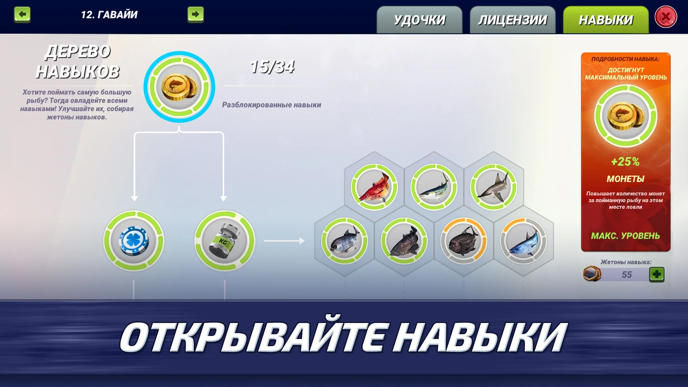 В Fishing Clash доступно 15 локаций, на каждой есть шанс поймать примерно 20 видов рыбы, включая экземпляры огромных размеров. Прекрасная анимация – по воде пробегают лёгкие волны и видны отблески света, шелестит листва. Русскоязычный интерфейс с удобным управлением кликами по экрану, система достижений, когда с каждым уровнем рыбак будет прокачивать свои умения ловли. Разнообразные виды наживки, пойманную рыбу можно изучать детально, кроме одиночной кампании доступен мультиплеерный режим с участием людей из разных стран. Каждый день интересные миссии с наградами для активистов, Fishing Clash хорошо оптимизирована, прохождение начинается сразу после установки. Лучше ставить игру на планшет, чтобы насладиться атмосферой на большом экране!