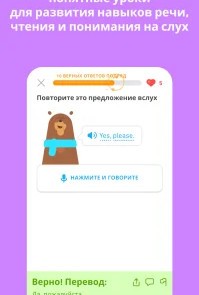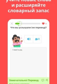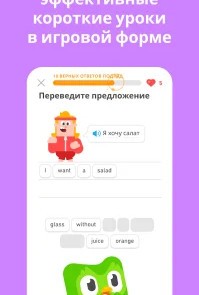 Duolingo: Учи языки бесплатно [Unlocked] Мобильное приложение – самоучитель для изучения иностранных языков. Русскоязычным пользователям на старте доступны 4 языка: испанский, немецкий, английский и французский. Кто уже говорит на английском, возможностей больше – есть польский, итальянский, китайский, больше 39 языков. В Duolingo пользователь проходит обучающий курс, разбитый по разделам и урокам, объединённым темами. К примеру, отдельные уроки из нескольких взаимосвязанных частей, есть быстрые повторения, что помогут закрепить пройденную тему. Урок включает 15 заданий, к которым система даёт подсказки – пользователь нажимает на новые слова в предложении и видит перевод.