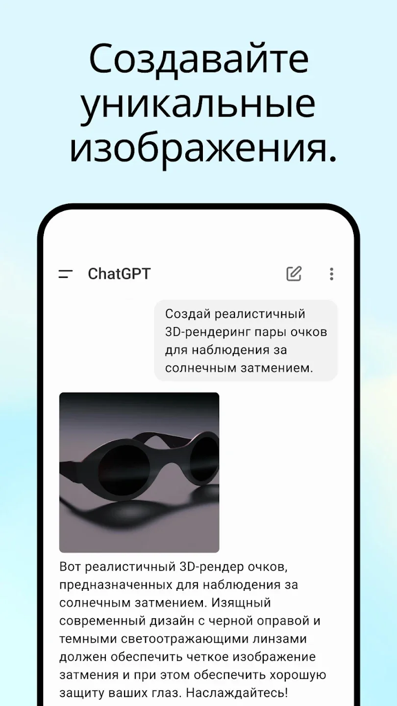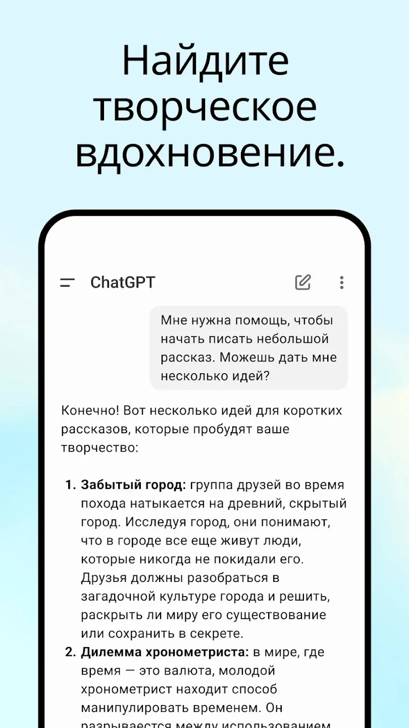 ChatGPT — это официальное мобильное приложение от OpenAI для взаимодействия с искусственным интеллектом через текстовые и голосовые запросы. Программа предоставляет доступ к языковой модели, способной отвечать на вопросы, решать задачи и помогать в различных сферах деятельности. Пользователь задаёт вопросы на естественном языке и получает развёрнутые ответы за несколько секунд. Приложение работает как персональный ассистент для обучения, работы, творчества и повседневных задач. ИИ обрабатывает запросы на множестве языков и адаптирует ответы под контекст диалога. Система запоминает историю беседы в рамках одного сеанса для более точных рекомендаций. ChatGPT помогает писать тексты, проверять код, переводить документы, составлять планы и объяснять сложные концепции. Интерфейс построен как чат с минималистичным дизайном без лишних элементов.