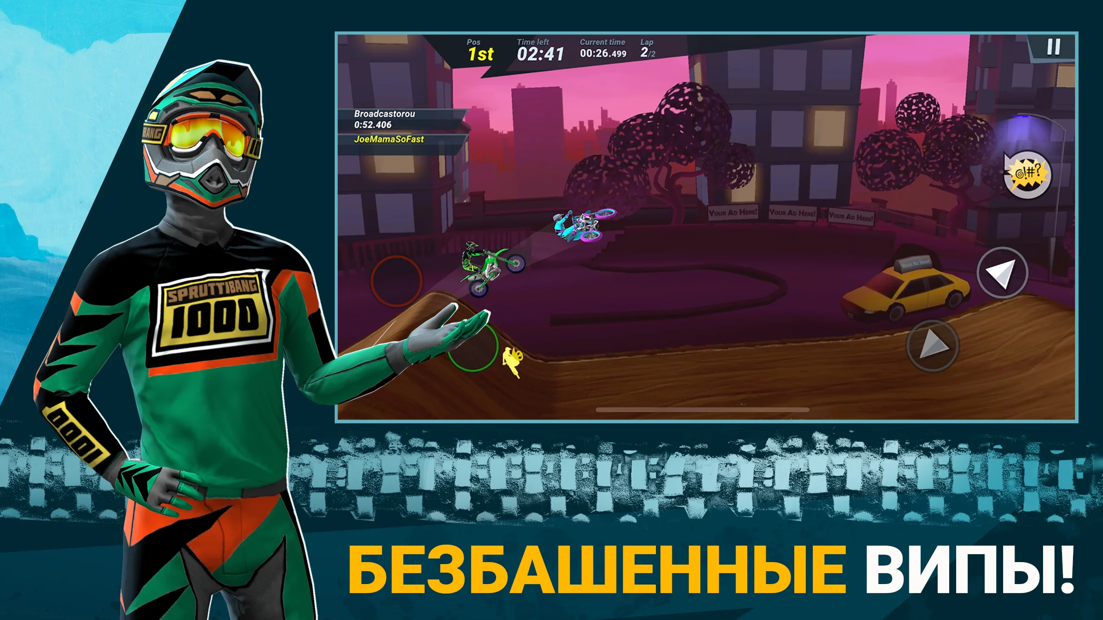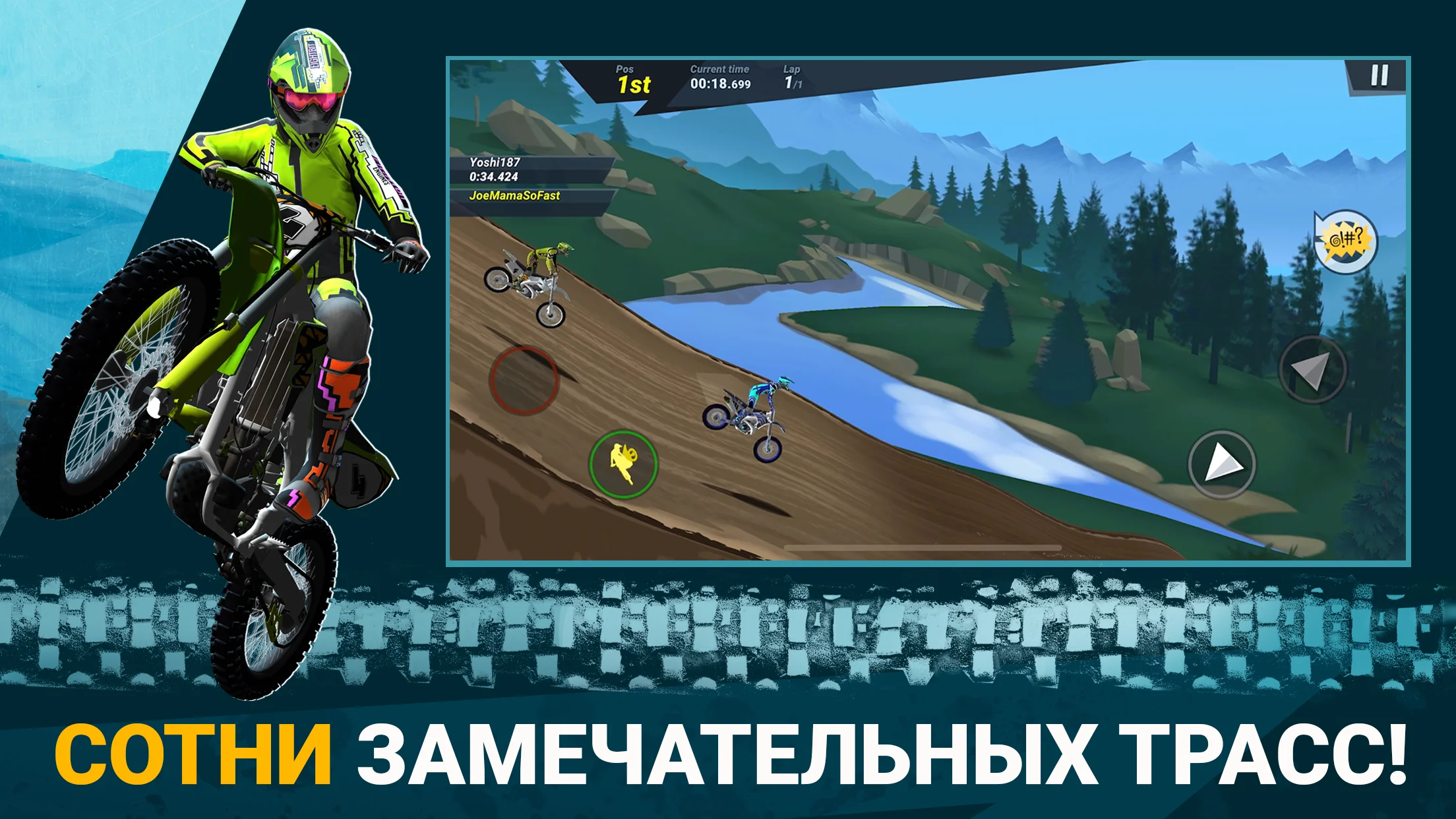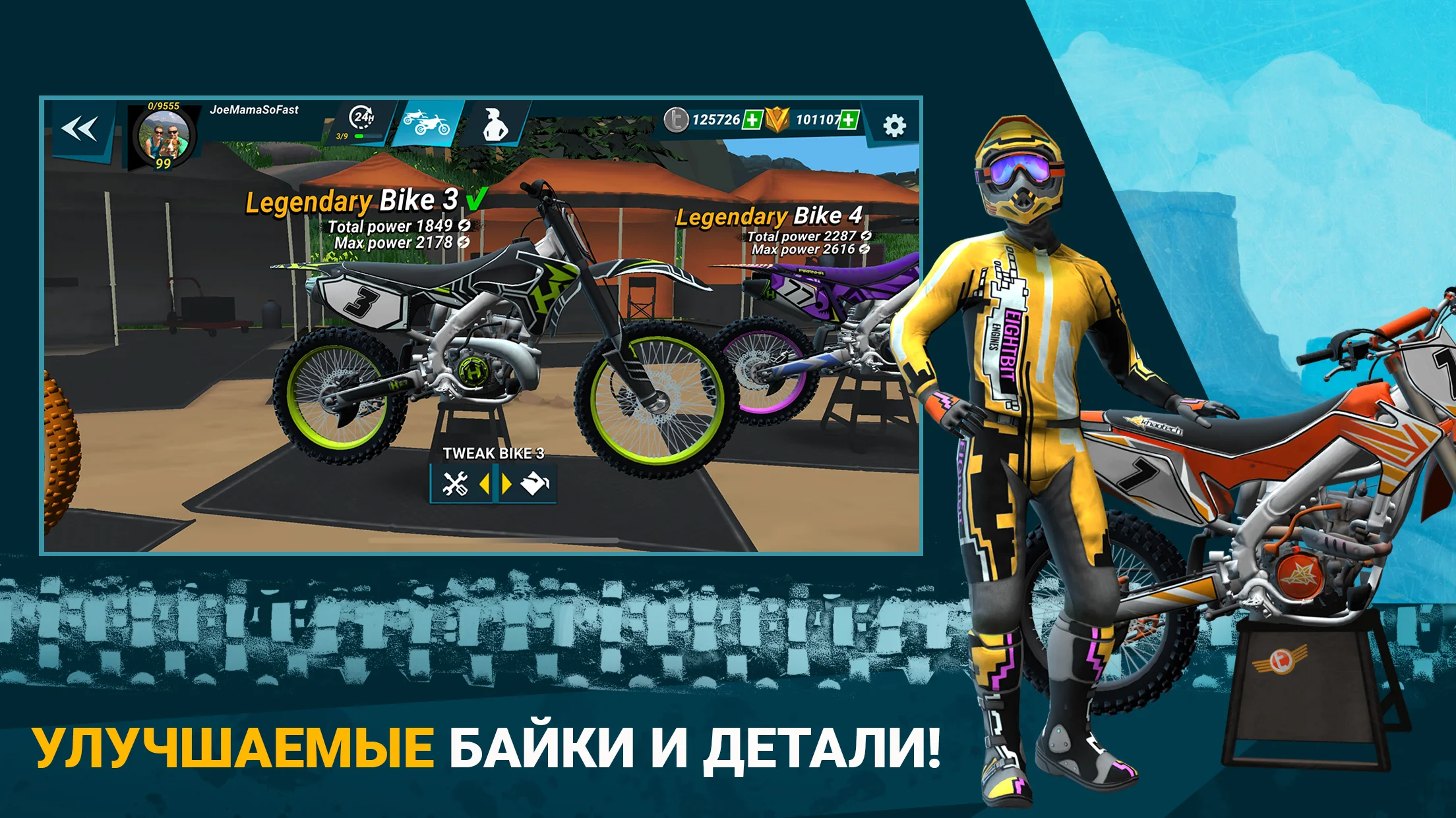 Mad Skills Motocross 3 (Unlimited Money) - Управляя мощным байком, необходимо победить в турнирах, обогнав всех соперников. Самое главное первым пересечь финишную черту. Сделать это допускается даже в прыжке. Побеждая других гонщиков, игрок может модернизировать свое транспортное средство. Предусмотрена замена практически всех деталей мотоцикла: от двигателя и колес до чипа управления и фар. Замена деталей происходит в специальном гараже. По мере участия в гонках повышается уровень мастерства пилота. Для его экипировки также предусмотрен апгрейд в виде нового шлема, перчаток и т.п. Сами гонки проходят по разнообразным живописным трассам разного уровня сложности.
