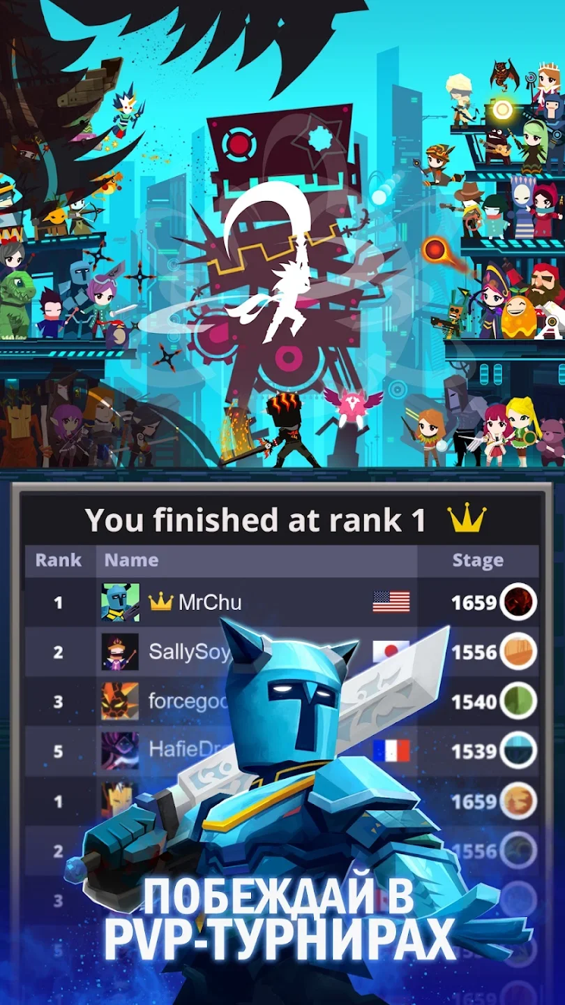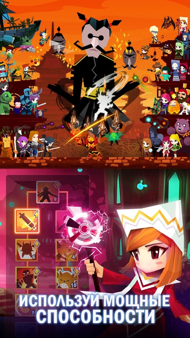 Убийца Титанов 2 (Tap Titans 2) - ролевая игра в приключенческом стиле повествования на Андроид с модом много денег.[/b] Все происходит в фэнтезийном мире, где нужно сыграть за бравого героя с мечем и другим холодным оружием, и он должен победить сотни боссов по всем миру. Боевая система строится на элементах кликера, что популярно в сегменте мобильных игр. От игрока требуется вовремя и быстро нажимать на экран, чтобы бить противника, а также активировать разные навыки и блоки. Полторы сотни титанов, и каждый сложнее прядущего, и это далеко не все враги, которых нужно победить.