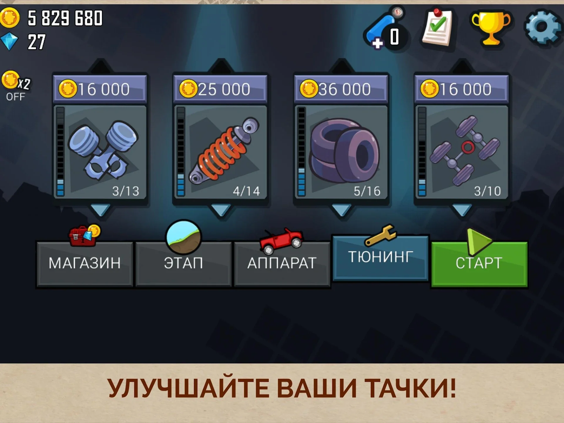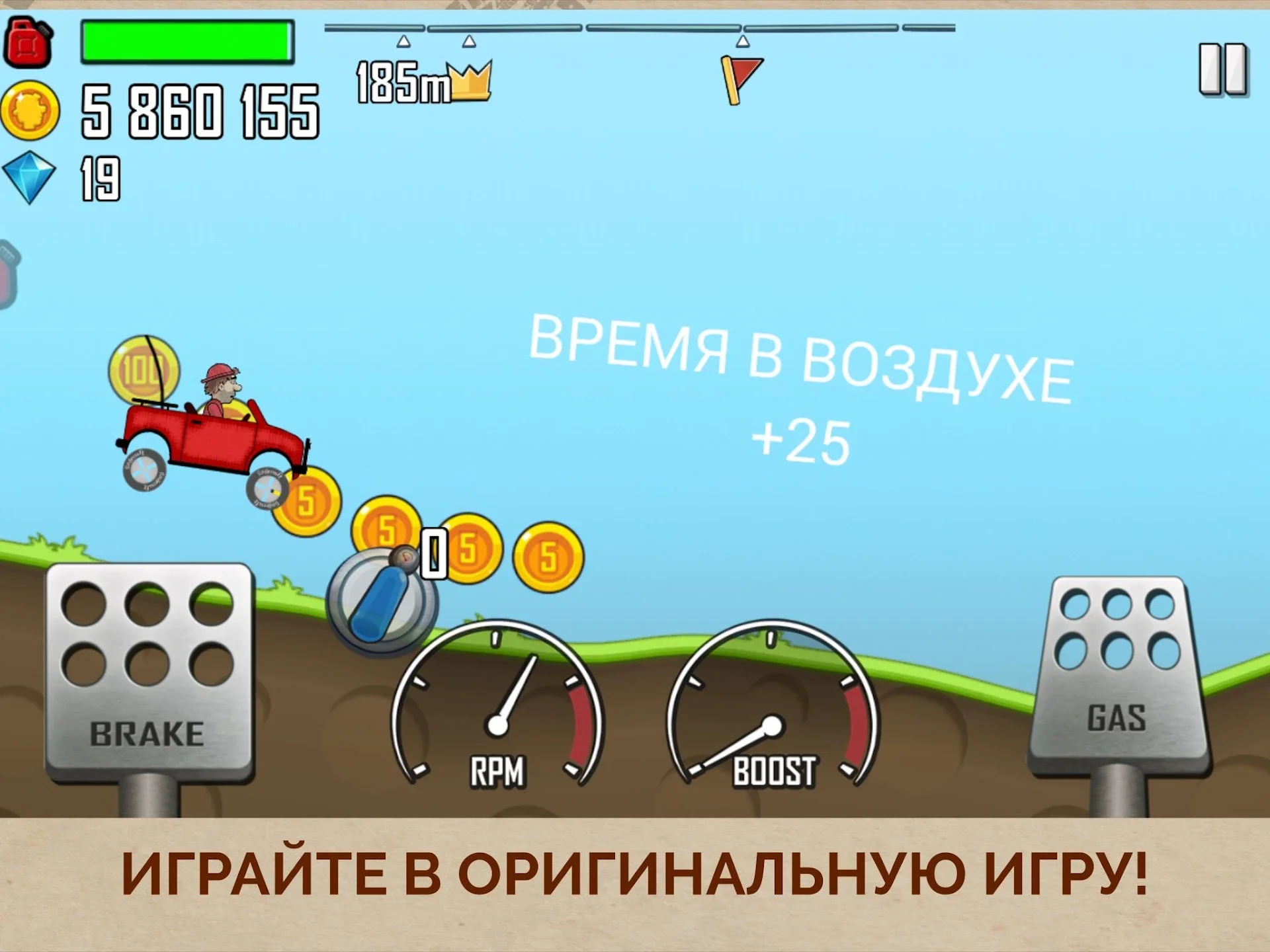 Старайтесь удерживать равновесие, чтобы не перевернуться. Рассчитывайте траекторию движения наперед. На пути будут встречаться монеты. Собирая их можно улучшать имеющийся автомобиль или подкопить и купить другой. Каждый из них имеет характеристики. Также реализована возможность перекрашивать машины. Чтобы проехать как можно дальше подбирайте канистры,и не дайте шкале топлива опустеть.