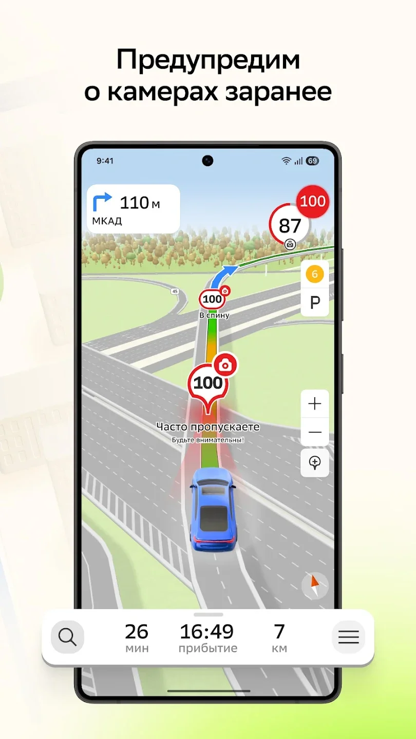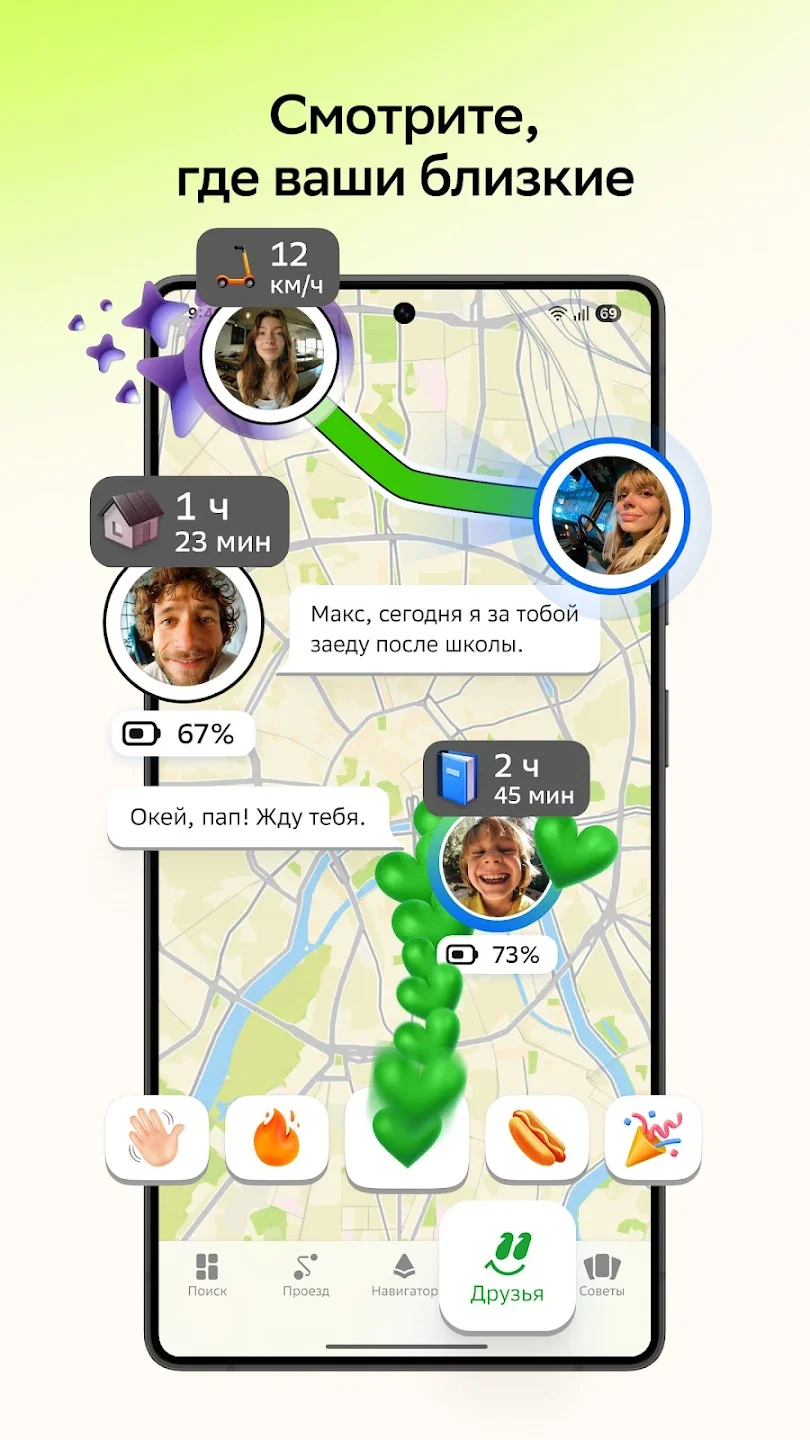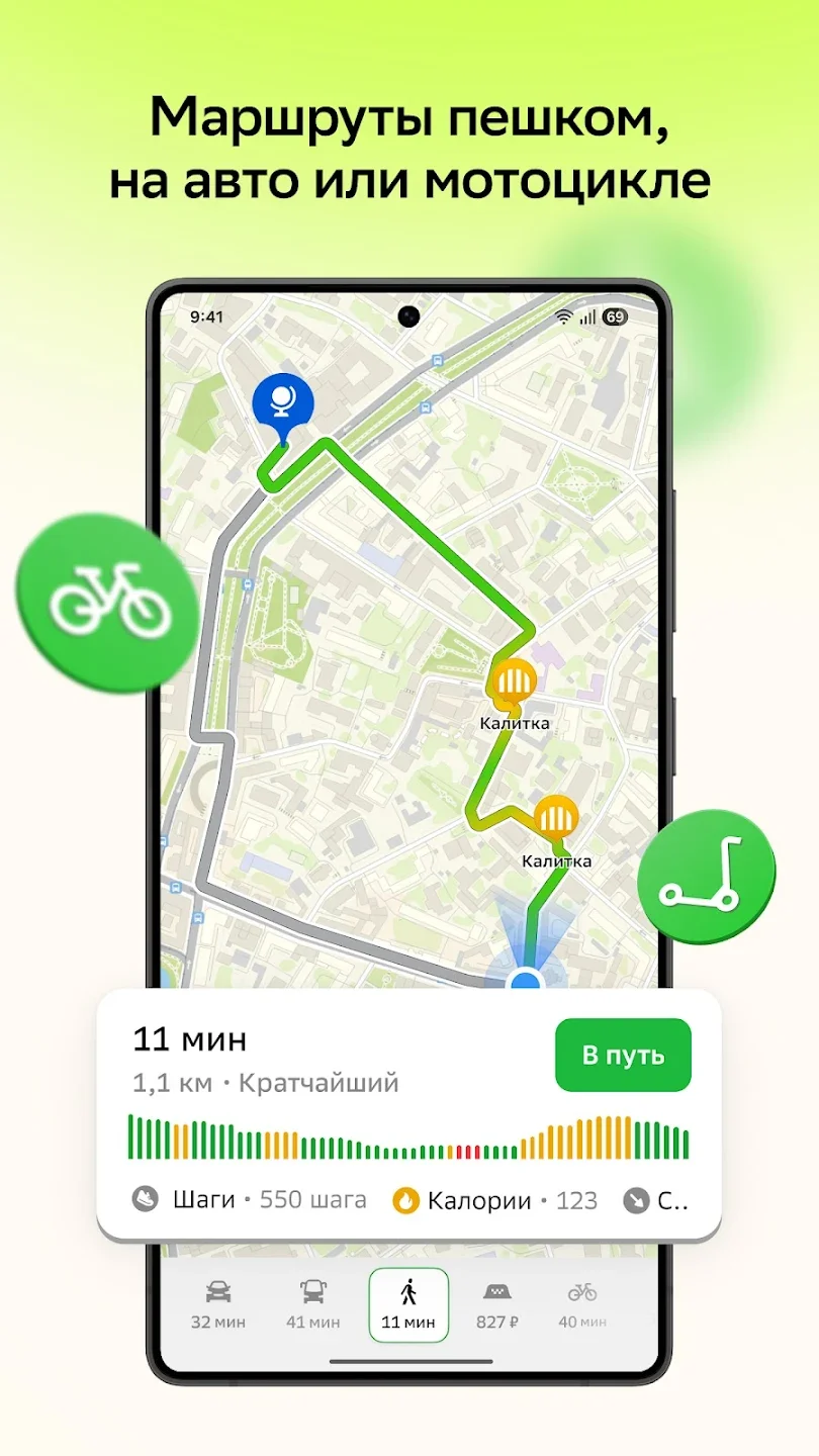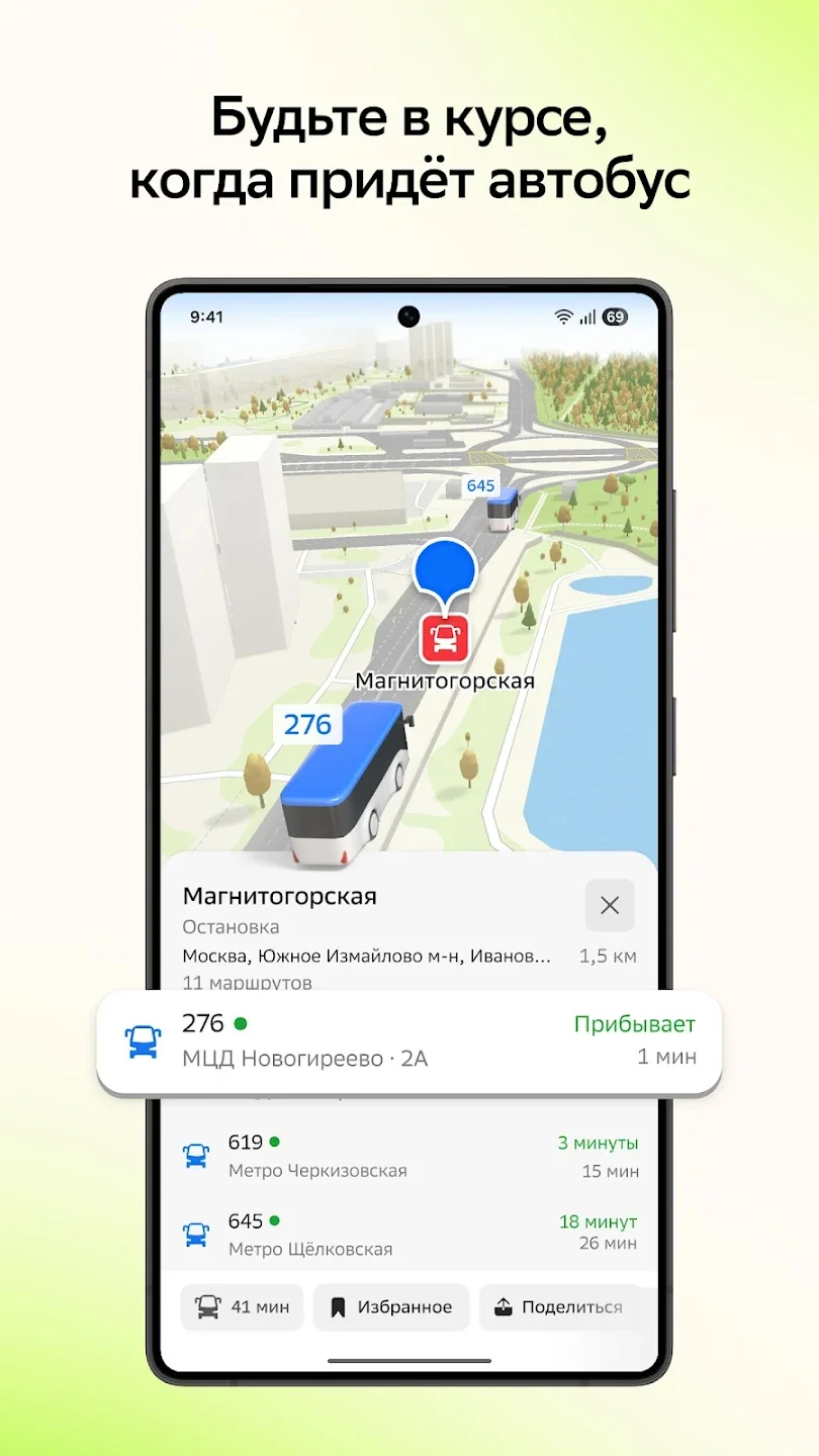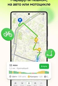 2ГИС следит за перемещениями пользователя онлайн, показывая, сколько осталось до конечного пункта. Сохраняет популярные маршруты – до дома, магазина, школы. Движения автобусов отображаются в реальном времени.