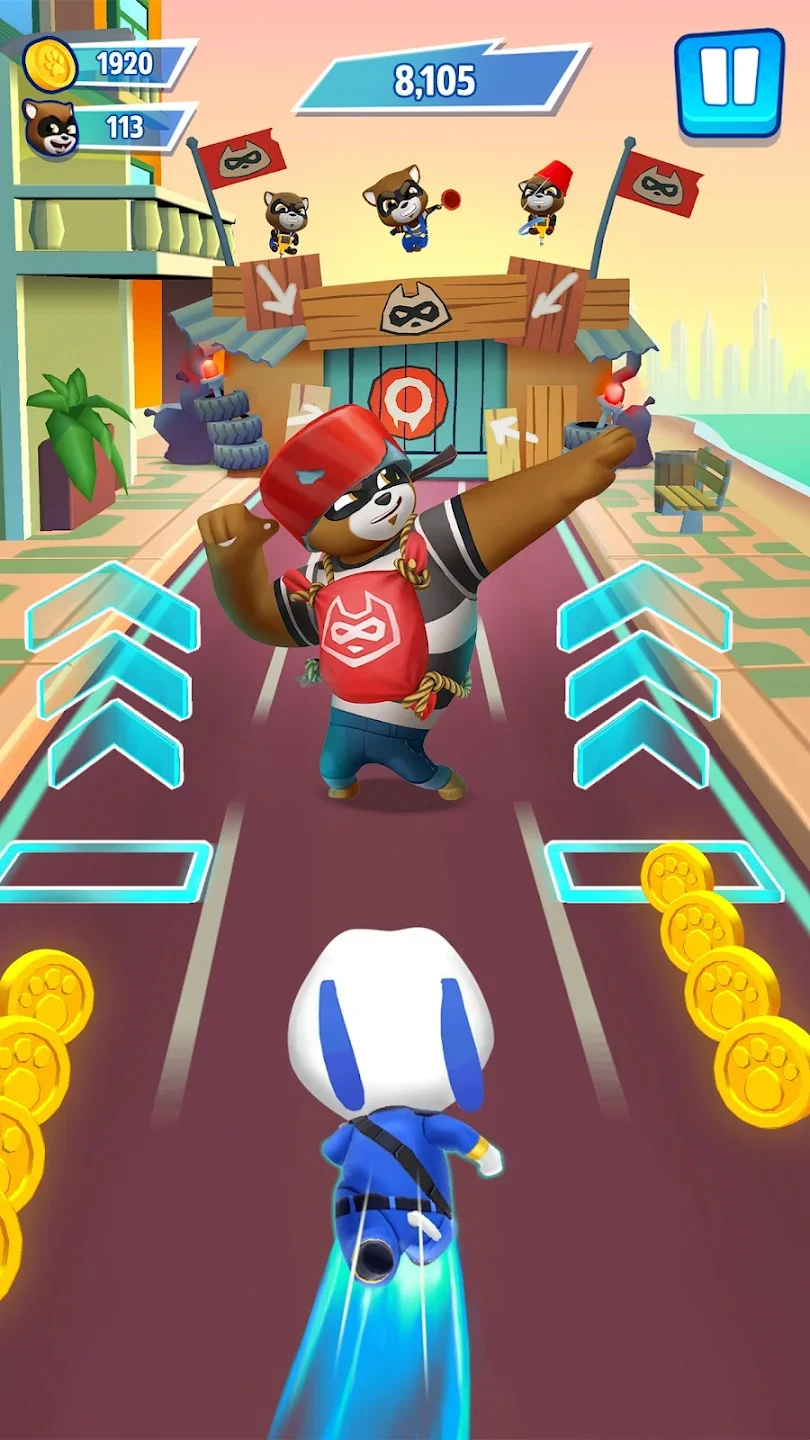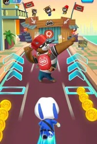 Игра включает систему прогрессии и улучшений. Ты открываешь новых персонажей за собранную валюту, прокачиваешь их способности и покупаешь костюмы. Каждая локация имеет тематический дизайн — городские улицы, стройки, парки и пляжи. Ты сражаешься с боссами-енотами в специальных миссиях — догоняешь их и атакуешь суперспособностями. Система заданий предлагает ежедневные челленджи за дополнительные награды. Ты собираешь чертежи для строительства зданий в родном городе героев — каждая постройка даёт бонусы к монетам или способностям. Графика яркая и красочная, анимации персонажей детализированы. Игра подходит для детей и взрослых благодаря простому управлению и семейному юмору.