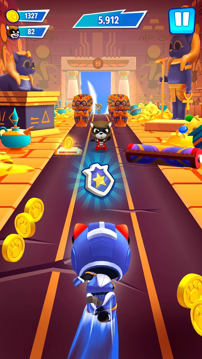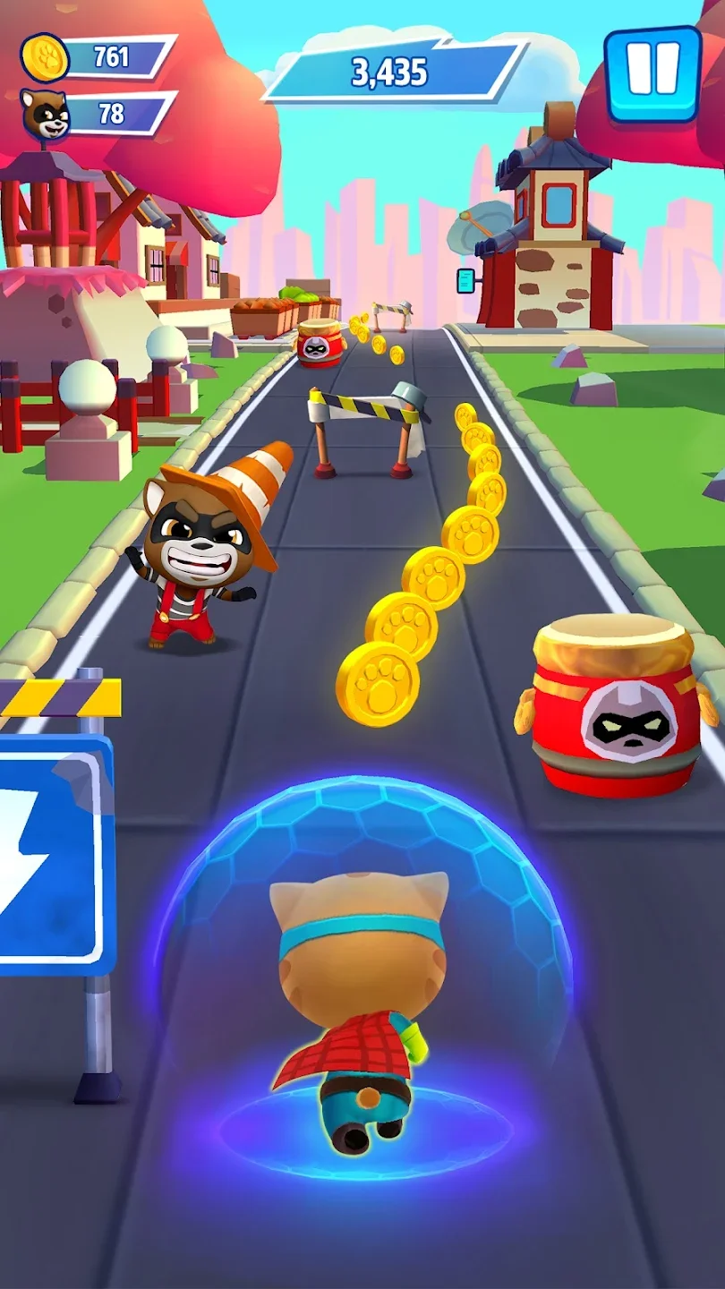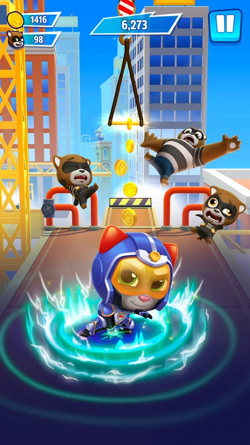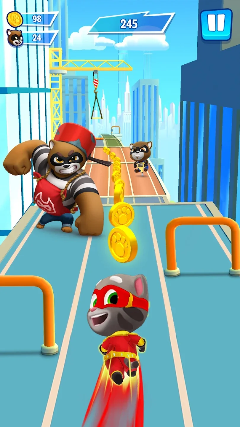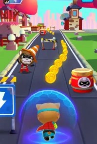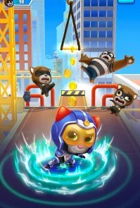 Говорящий Том: погоня героев — это аркадный бесконечный раннер с персонажами франшизы Talking Tom. Банда енотов захватила город и похитила друзей Тома — Анджелу, Бена, Хэнка и Джиндера. Ты управляешь Томом и другими героями, бежишь по улицам, уворачиваешься от препятствий и собираешь монеты. Каждый персонаж обладает уникальной суперспособностью — Том использует ракетный ранец, Анджела стреляет конфетти, Бен создаёт щиты. Ты переключаешься между дорожками свайпами, прыгаешь через барьеры и скользишь под препятствиями. Цель игры — пробежать максимальное расстояние и собрать как можно больше монет за забег.