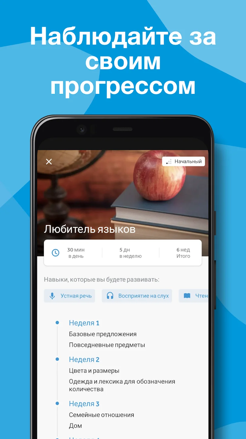 Ты проходишь короткие уроки и закрепляешь материал сразу на практике. Занятия занимают 5–10 минут. Ты тренируешь слух и речь в каждом задании. Технология распознавания речи анализирует произношение. Ты получаешь обратную связь и исправляешь ошибки. Уроки включают реальные ситуации из жизни. Ты учишься говорить на работе, в поездке и в разговоре. Приложение подбирает план под твои цели. Контент доступен даже без интернета после загрузки.