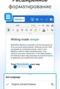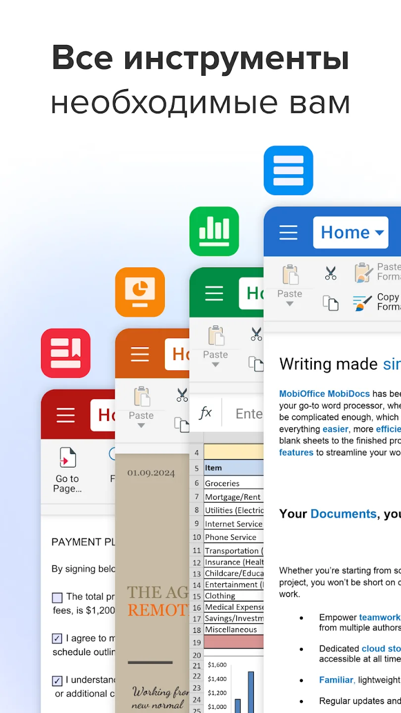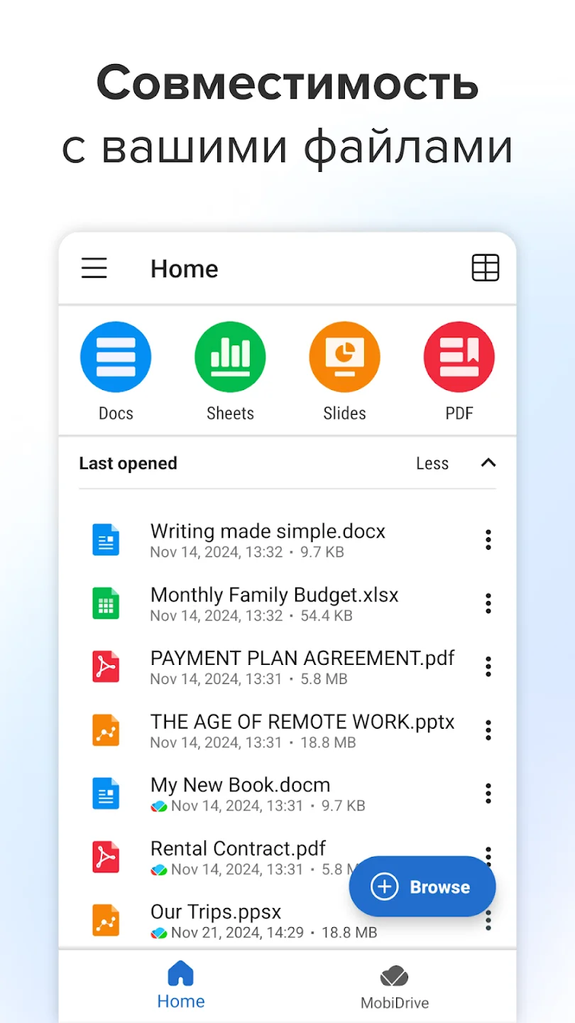 MobiOffice: Word, Sheets, PDF — удобный офисный набор для Android, который помогает создавать, редактировать и просматривать документы в любом месте. С первого экрана понятно: перед вами приложение, которое заменяет целый офисный пакет и делает работу с файлами простой и быстрой. Открывайте документы Word, таблицы и PDF — всё работает легко и без лишних настроек.