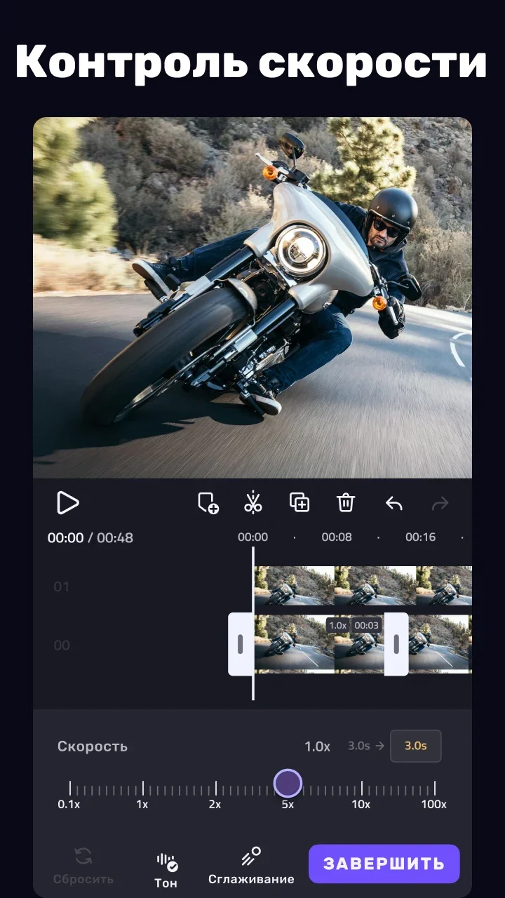 - Полный набор инструментов для обрезки, склейки и цветокоррекции.