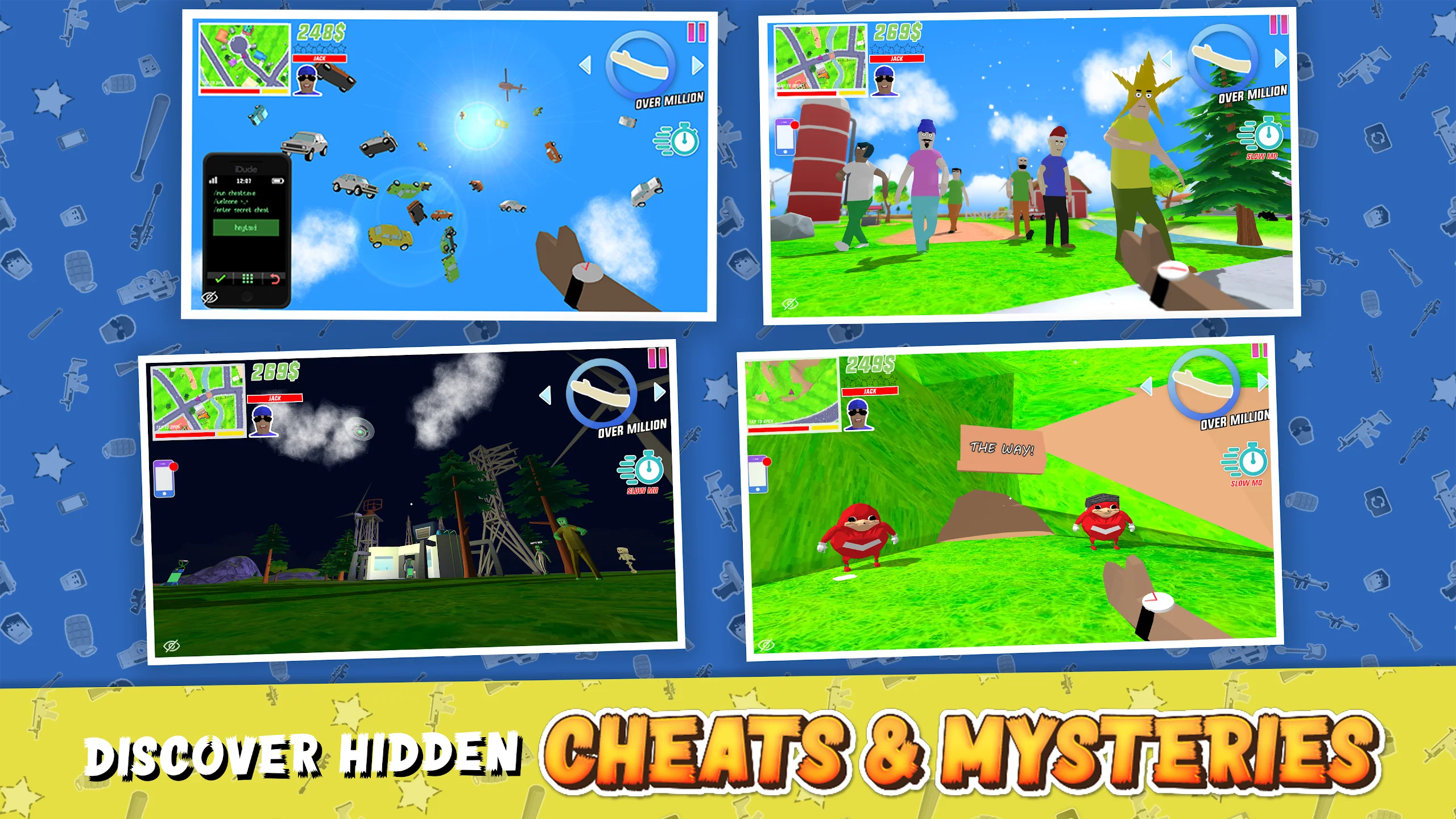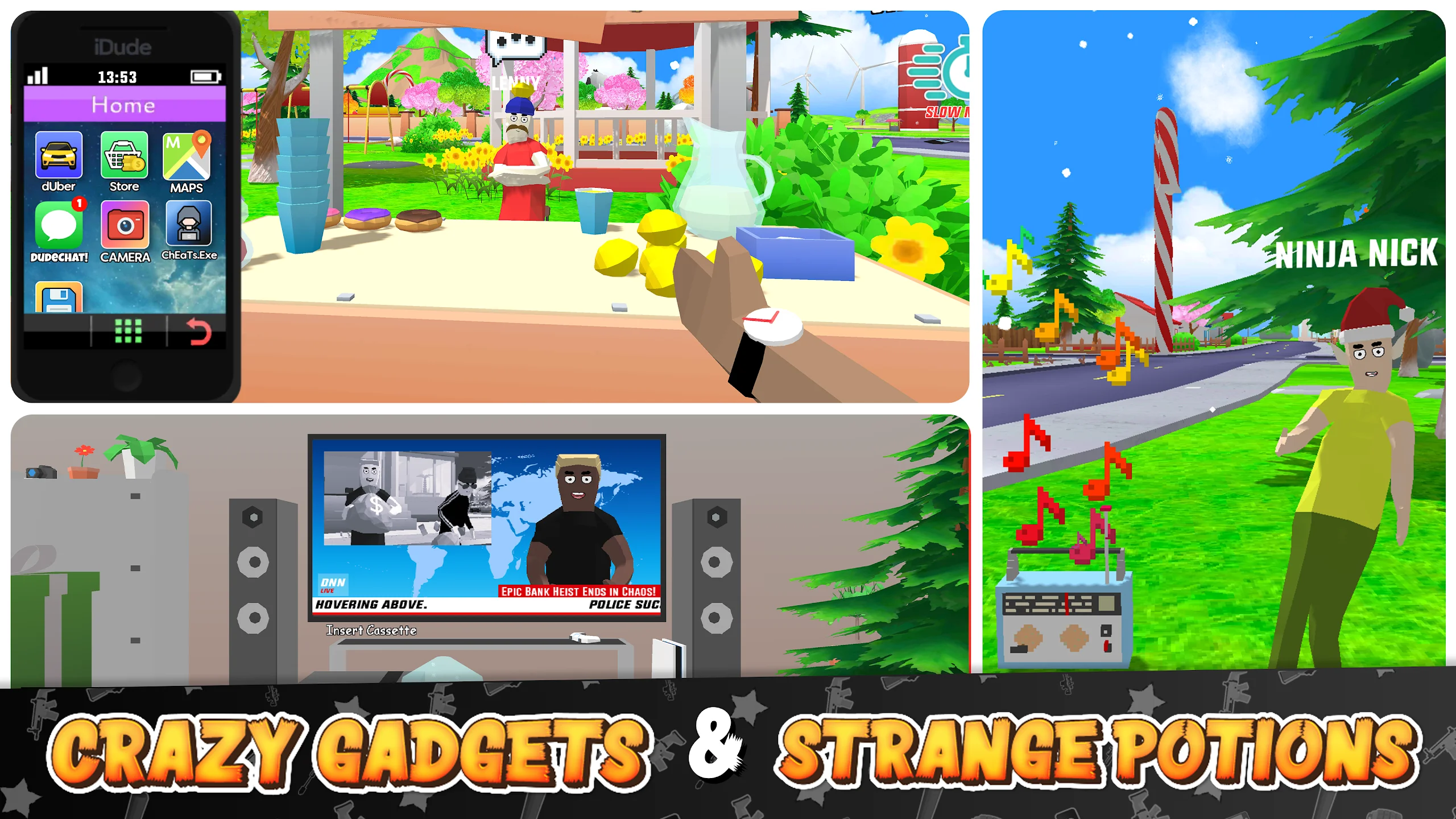 Геймплей строится на свободе действий. Ты можешь кататься по улицам на любых автомобилях, устраивать перестрелки с NPC, прыгать с крыш или летать по воздуху с помощью мод-функций. В каждом районе города тебя ждут смешные сцены и неожиданные ситуации. Играть становится ещё интереснее, потому что мод открывает полёт, ускорение, повышенный урон и бесконечные патроны. Даже если раньше какие-то задания казались сложными, во взломанной версии Dude Theft Wars ты всегда выйдешь победителем.