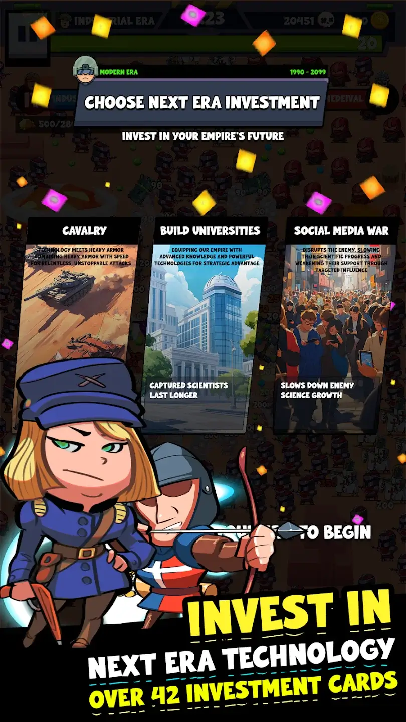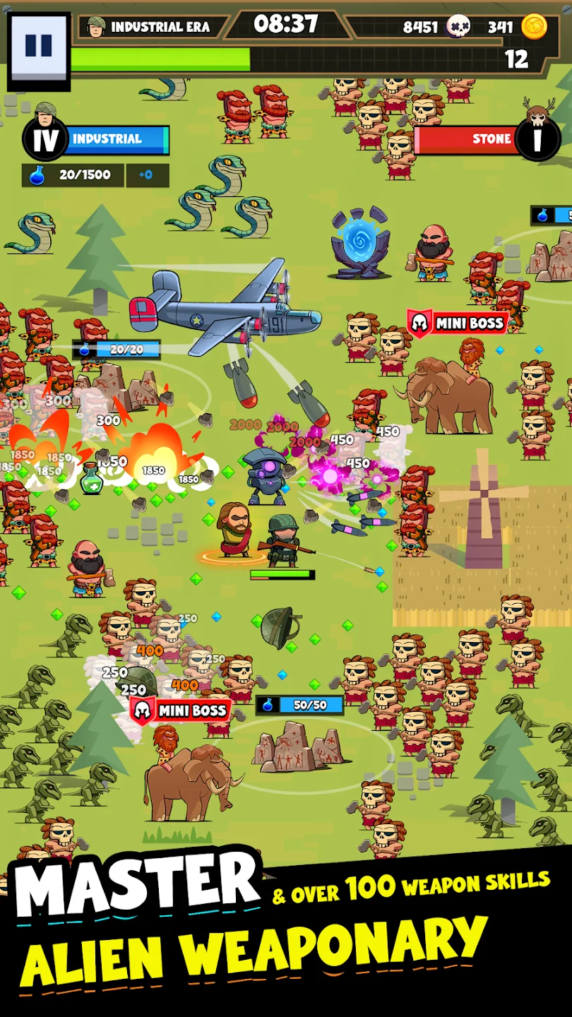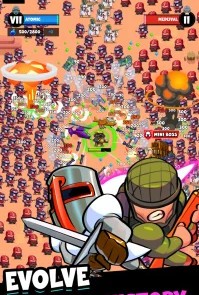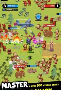 Empires Survivors! переносит игрока в мир, где нужно развивать цивилизацию и одновременно отражать постоянные атаки врагов. Начало игры проходит в каменном веке с минимальным набором оружия и навыков. Постепенно открываются новые эпохи, технологии и уникальные артефакты, которые усиливают армию и дают преимущества в бою. Скачать игру на андроид можно бесплатно, а в последняя версия добавлены новые боссы, уровни и система прокачки цивилизации через веру и популярность.