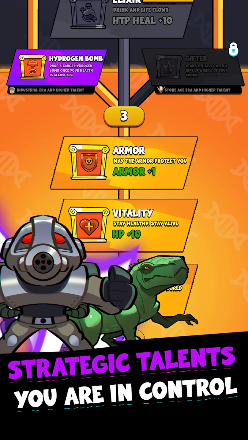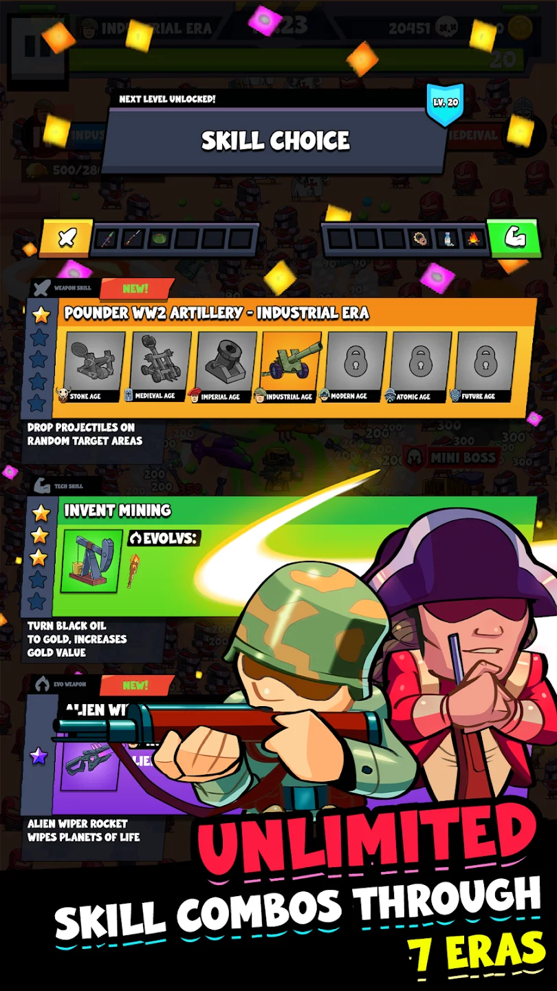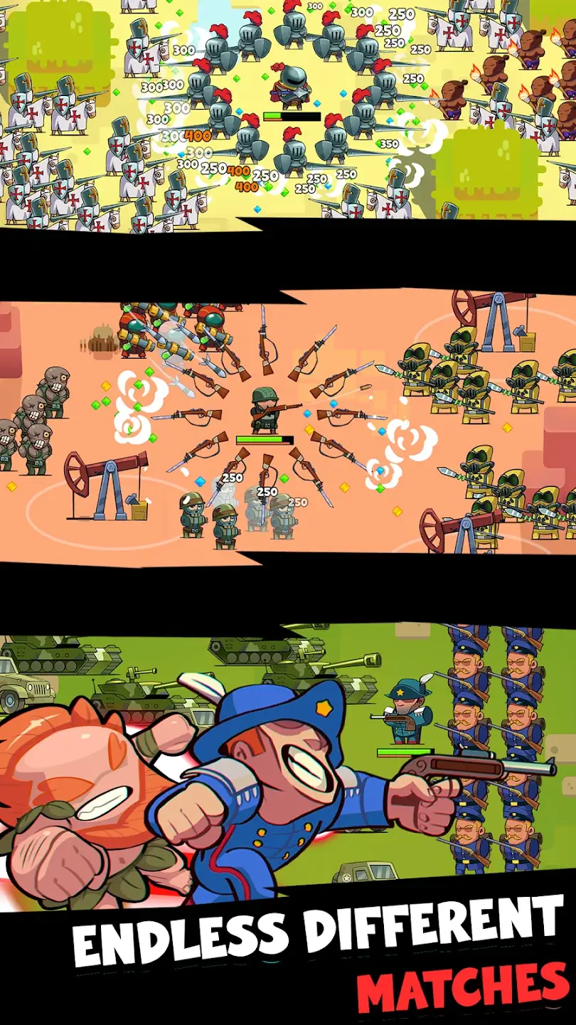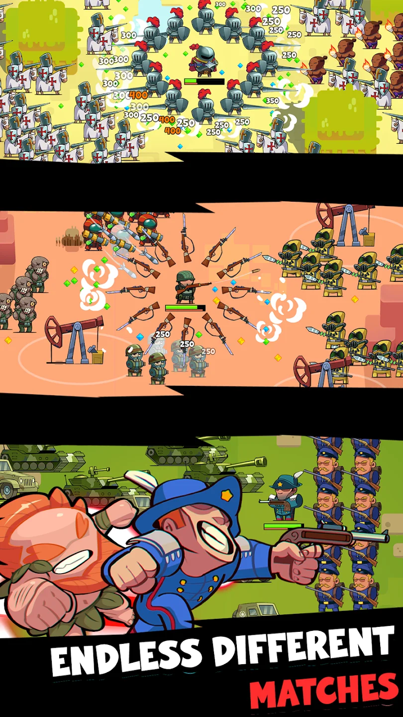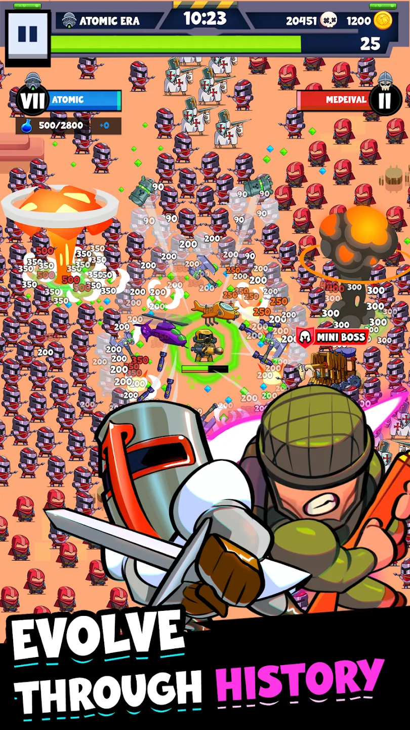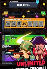 Игровой процесс сочетает элементы рогалика и стратегии. Игрок уничтожает волны противников, получает опыт и открывает более 100 навыков — от холодного оружия до современных дронов. Система уровней насчитывает более 200 карт, каждая из которых предлагает уникальных врагов и условия. Оружие можно комбинировать для создания мощных связок, а инвестиционные карты дают долгосрочные бонусы. Геймплей требует грамотного распределения ресурсов между усилением армии и развитием технологий, чтобы выживать всё дольше.