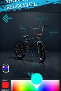 - Кастомизация байка — меняй раму, колёса, руль, подбирай цвета и наклейки