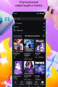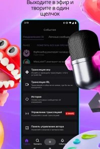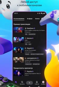 - Просмотр прямых трансляций по играм, музыке и подкастам