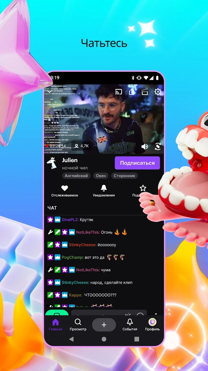 Twitch — это крупнейшая платформа для прямых трансляций и общения в реальном времени. Здесь ты смотришь стримы по играм, музыке, искусству и подкастам. Приложение открывает доступ к тысячам каналов, где зрители и авторы взаимодействуют через чат. Каждый пользователь может подписаться на стримера, следить за обновлениями и получать уведомления о начале эфиров. Интерфейс прост: лента рекомендаций, список подписок и чат расположены удобно для быстрой навигации.