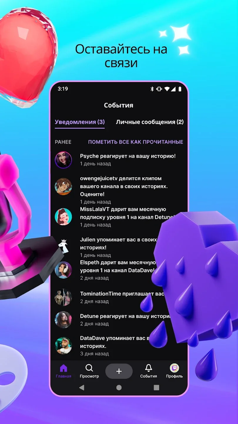 - Подписки на каналы и уведомления о начале эфиров