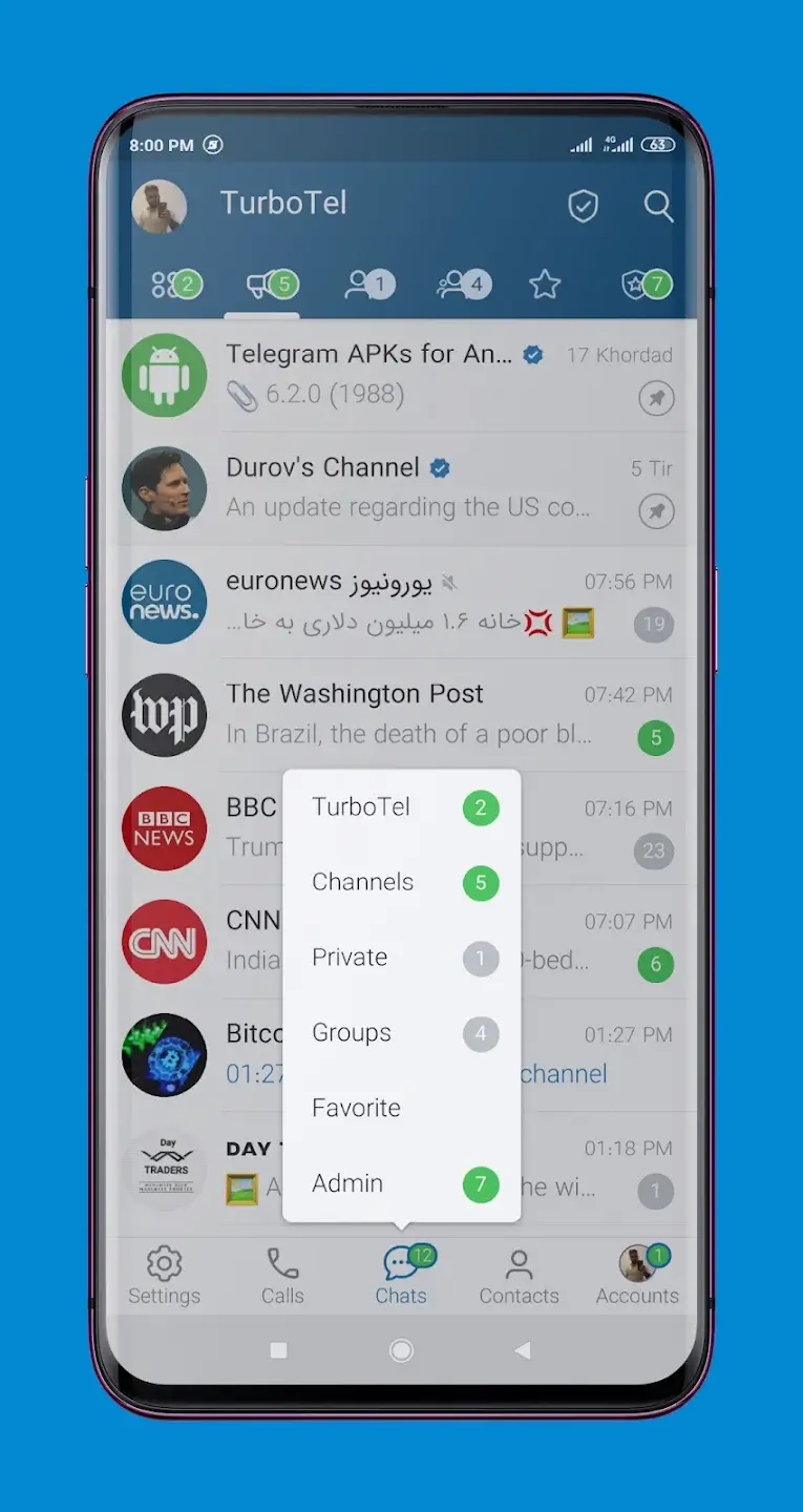 Приложение открывает доступ к улучшенному интерфейсу и дополнительным инструментам персонализации. Пользователь настраивает внешний вид, управление, фильтры чатов и способы отображения сообщений. TurboTel Pro повышает удобство работы с группами, каналами и файлами, ускоряет загрузку и даёт больше контроля над уведомлениями. Всё это помогает держать нужные диалоги под рукой и сокращает время на поиск сообщений.