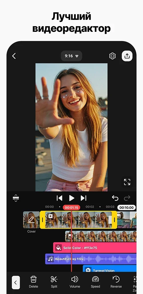 KineMaster помогает собирать ролики любой сложности. Таймлайн поддерживает несколько дорожек для видео, музыки, голоса и графики. Пользователь добавляет переходы, настраивает скорость, регулирует цвет и применяет визуальные эффекты. Приложение подходит как для простых видео, так и для сложных проектов с титрами и анимацией. Экспорт работает быстро и поддерживает высокое качество вплоть до 4K.
