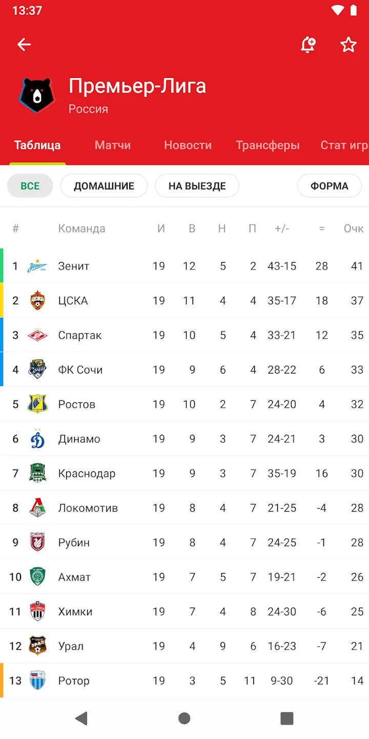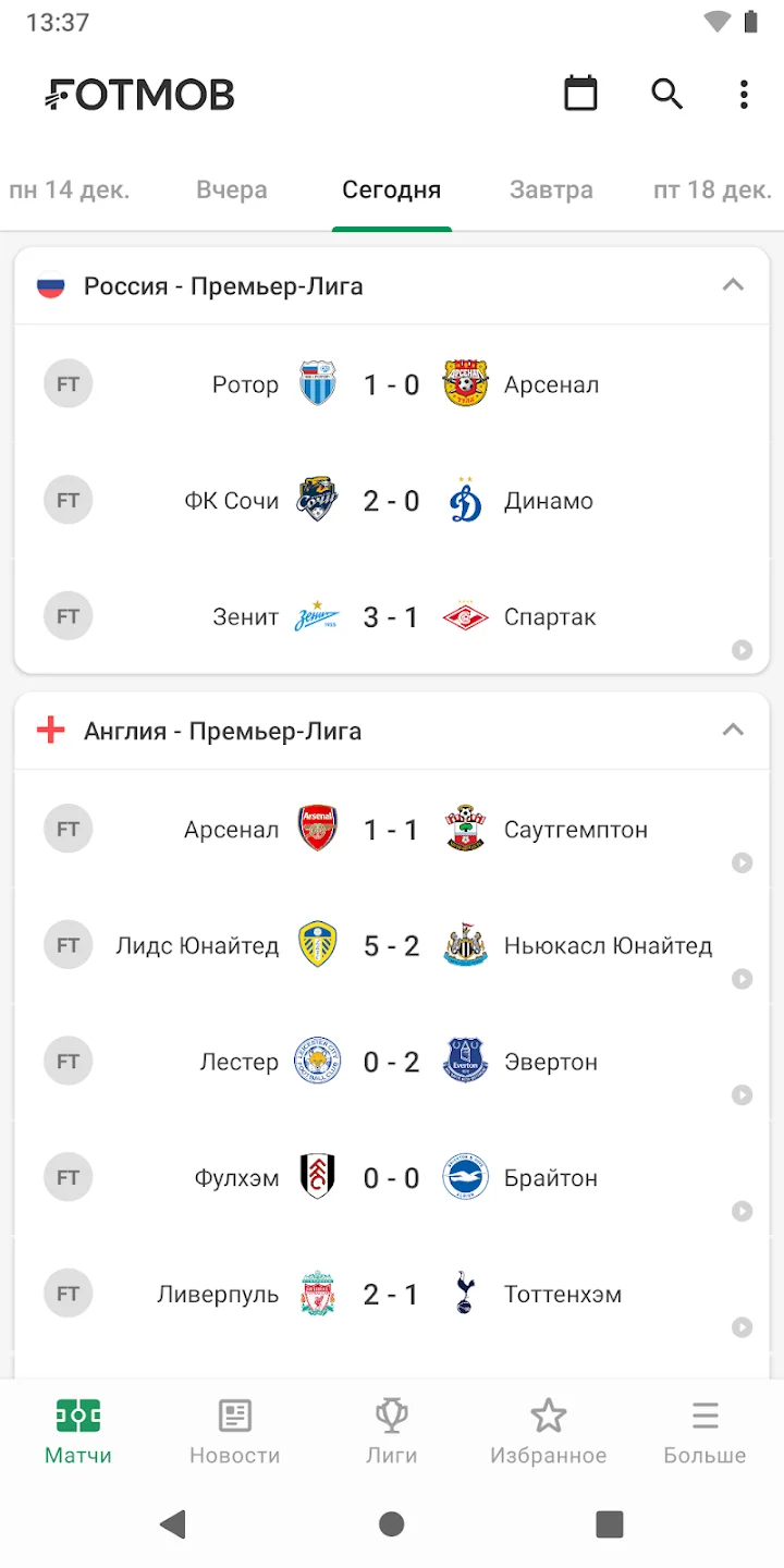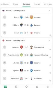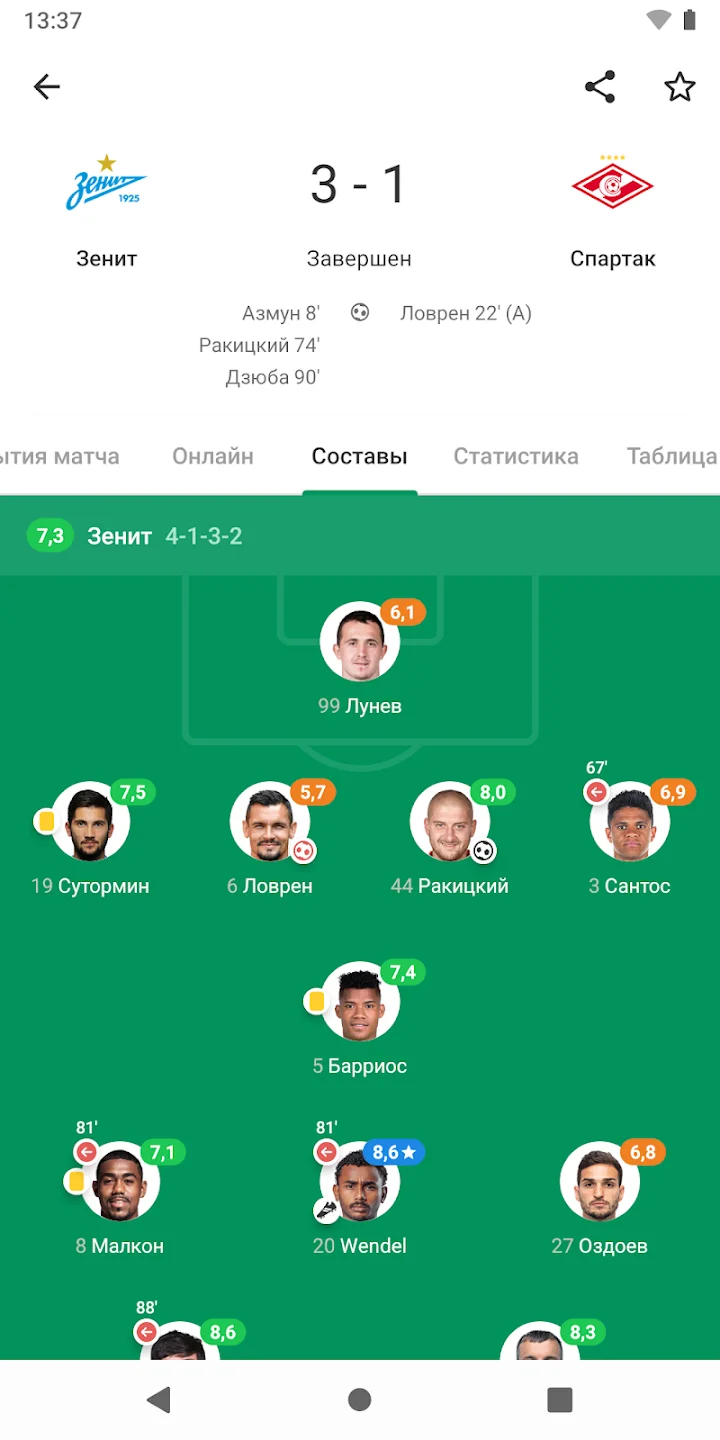 - Уведомления по событиям. Голы, стартовые составы, важные моменты и окончания матчей.