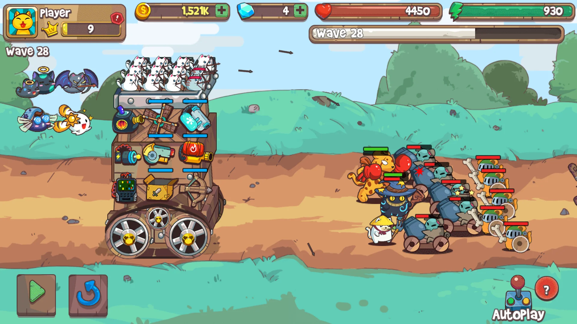 Геймплей построен на idle-механике, то есть ваши коты сражаются автоматически, а вы решаете, куда вкладывать ресурсы: усилить атаку, увеличить скорость или призвать больше бойцов. Каждая волна врагов становится всё опаснее, поэтому нужно продумывать тактику и вовремя апгрейдить свою армию. Между боями можно расслабиться — игра работает даже в фоновом режиме, накапливая награды.