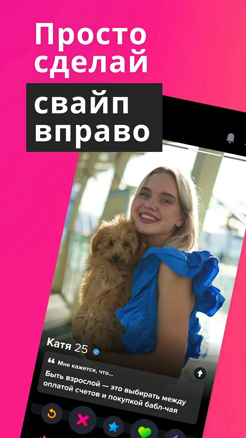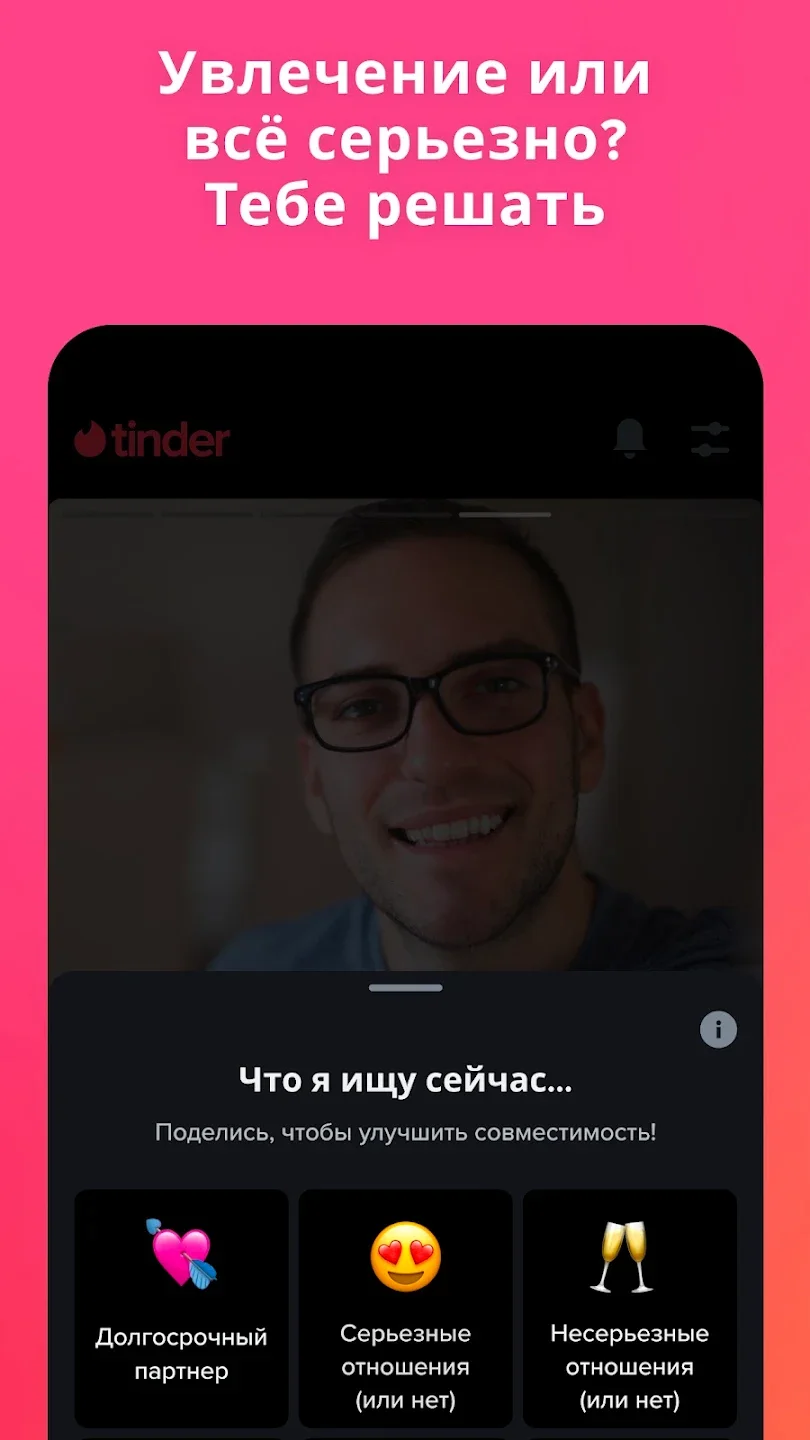 Tinder — это приложение для знакомств на Android, которое помогает находить людей рядом, общаться и создавать новые связи. Приложение предназначено для простого и быстрого знакомства: вы просматриваете профили, выбираете понравившиеся и начинаете диалог после взаимного совпадения.