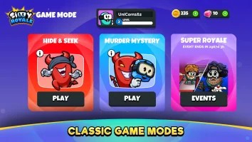 Игра поддерживает создание частных матчей с друзьями и режим зрителя, который позволяет наблюдать за игрой, не участвуя напрямую. Игроки могут получить собственного Глупого Любимца, который сопровождает их во всех режимах и помогает в опасных ситуациях. Глупые Любимцы обладают уникальными способностями и развиваются вместе с игроком. Кроме того, Silly Royale предлагает систему мини-заданий, индивидуальные настройки карт и игровой процесс с социальной дедукцией, что повышает стратегическую составляющую и взаимодействие между игроками.