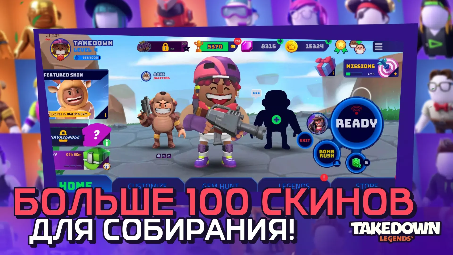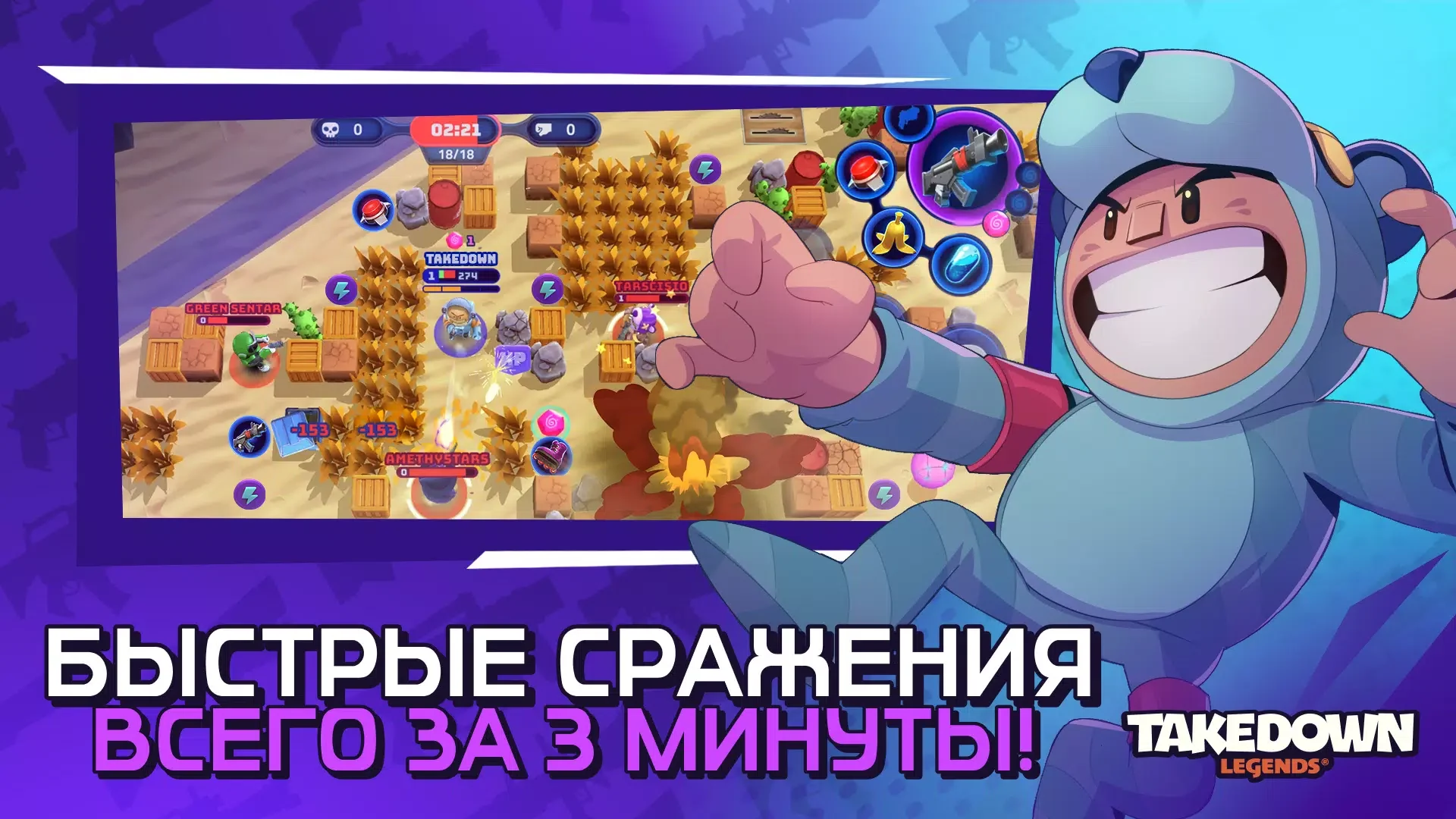 Takedown Legends -это многопользовательский шутер с видом сверху, построенный вокруг быстрых матчей и сражений между игроками. Игра сочетает элементы battle royale и аркадного экшена. Ты управляешь бойцом и участвуешь в коротких боях, где цель одна — остаться последним. Каждая сессия длится около 10 минут и держит высокий темп с первых секунд. Проект делает акцент на ярких персонажах и динамичных перестрелках. Визуальный стиль выделяется насыщенными эффектами и читаемой картиной боя.